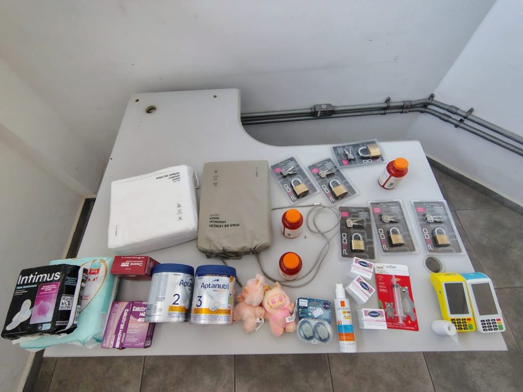 Segundo a Polícia Militar, durante a abordagem foram encontrados diversos itens no interior do veículo e com os detidos. Entre os objetos apreendidos estavam suplementos alimentares, cosméticos, brinquedos, roupas de cama, bolsas, carteiras, celulares e quantias em dinheiro — inclusive em moedas estrangeiras.