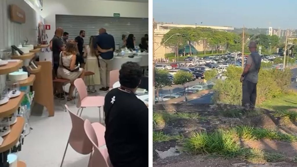Em um dos registros, é possível ver o momento em que consumidores se abrigam no interior de uma loja após ouvir o barulho associado aos disparos. Testemunhas relataram que a correria começou rapidamente e que seguranças orientaram o público a permanecer nas áreas internas.