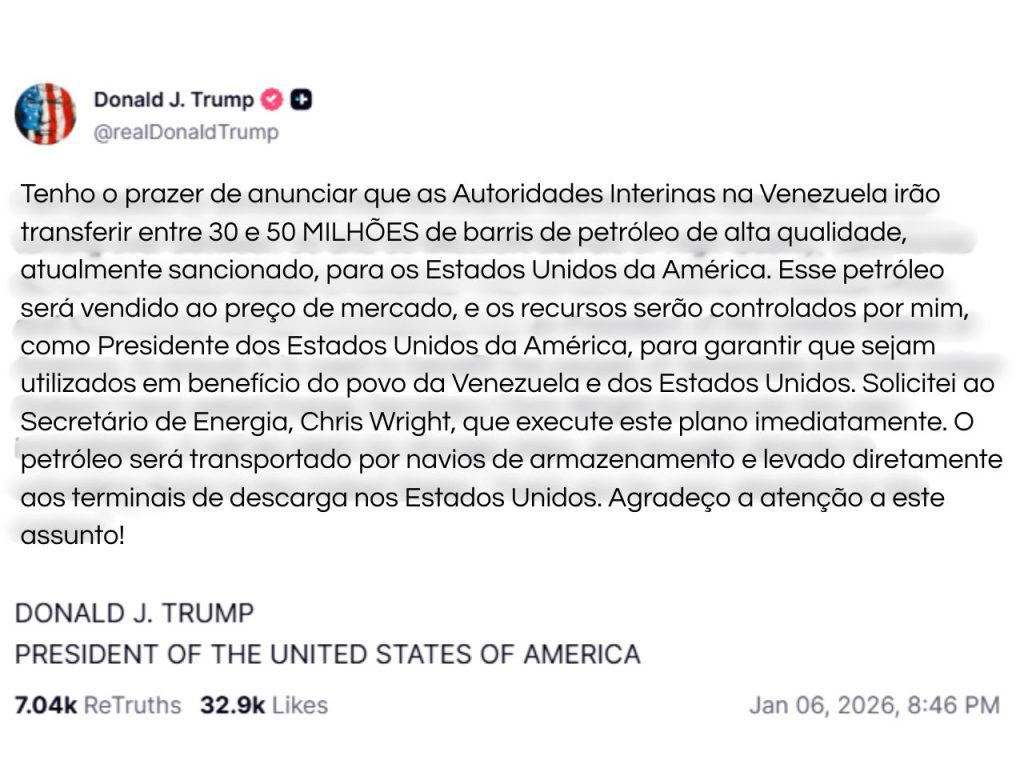O acordo anunciado por Trump nesta terça-feira prevê que os barris venezuelanos sejam levados em navios-tanque escoltados por forças armadas, sob supervisão direta da Casa Branca. Os recursos arrecadados com a venda do petróleo ficarão sob controle dos EUA, com a justificativa de beneficiar tanto a população venezuelana quanto os interesses estratégicos americanos.