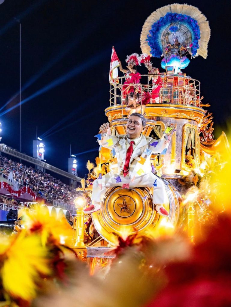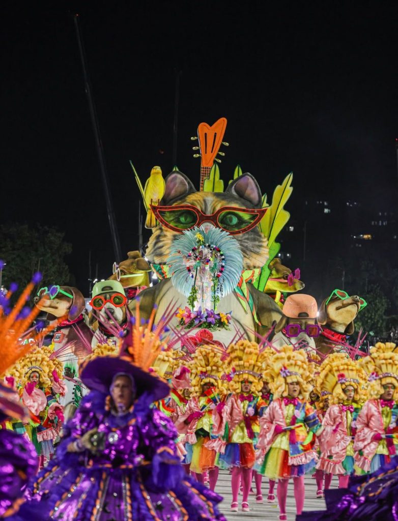 A escola também homenageou o ativismo de Rita na causa animal, com destaque para o tripé em tributo ao cachorro Orelha. No último carro, “Lança Perfume”, estava Roberto de Carvalho, viúvo da artista. Um possível problema foi um espaçamento entre alas, observado por jurados, que pode impactar na pontuação.