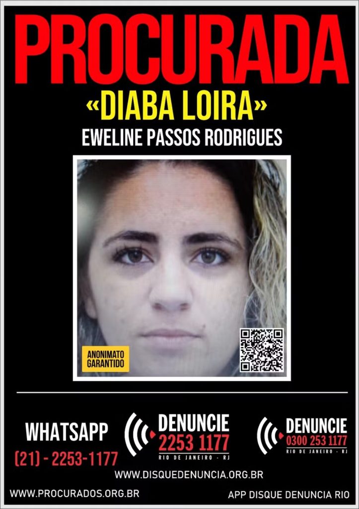 A traficante Eweline Passos Rodrigues, conhecida como Diaba Loira, de 28 anos, foi encontrada morta na noite desta quinta-feira (14), em Cascadura, na Zona Norte do Rio. O corpo da criminosa, que ostentava armas em redes sociais e era jurada de morte por ter mudado de facção, estava enrolado em um lençol, com marcas de tiros na cabeça e no tórax.