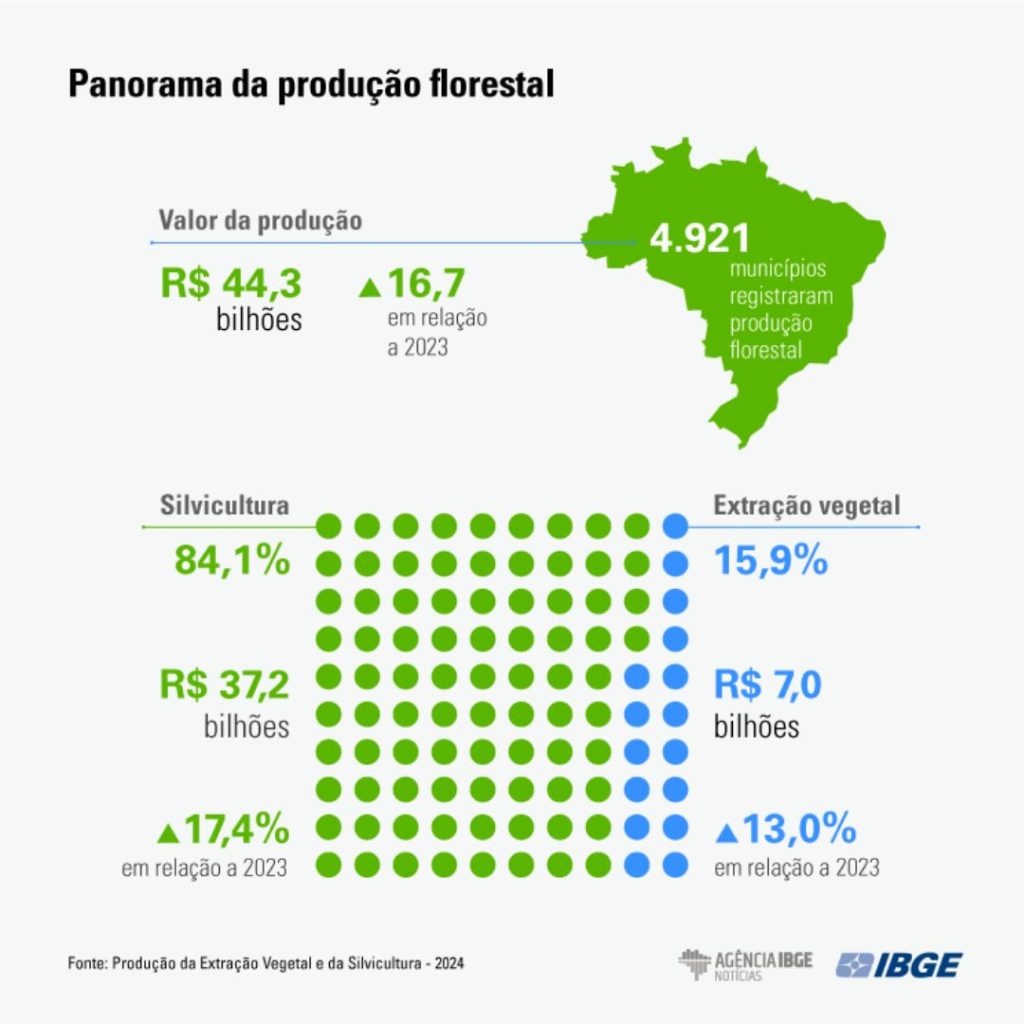 As florestas brasileiras — tanto nativas quanto plantadas — movimentaram R$ 44,3 bilhões em 2024, de acordo com levantamento do Instituto Brasileiro de Geografia e Estatística (IBGE) divulgado nesta quinta-feira (25). O resultado representa um salto de 16,7% em relação a 2023 e mais que o dobro do registrado em 2019, acumulando crescimento de 140% em cinco anos.