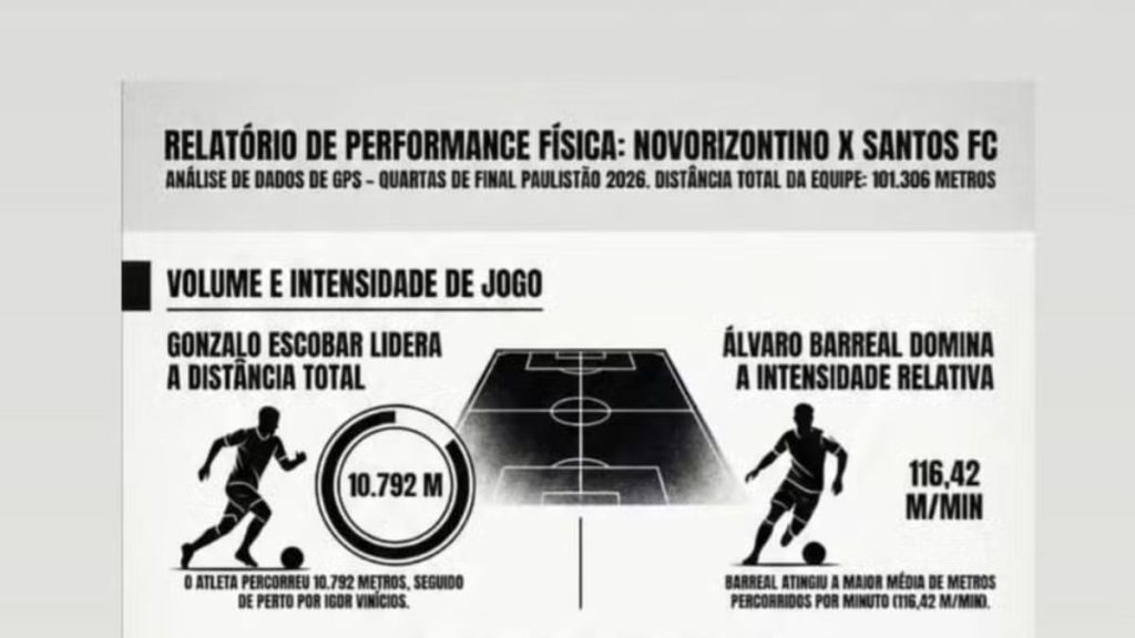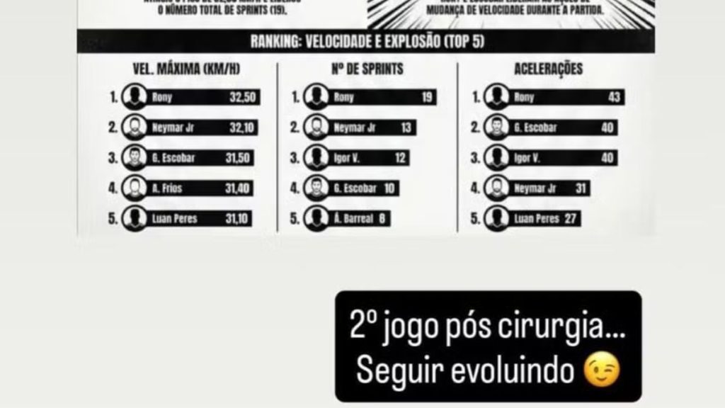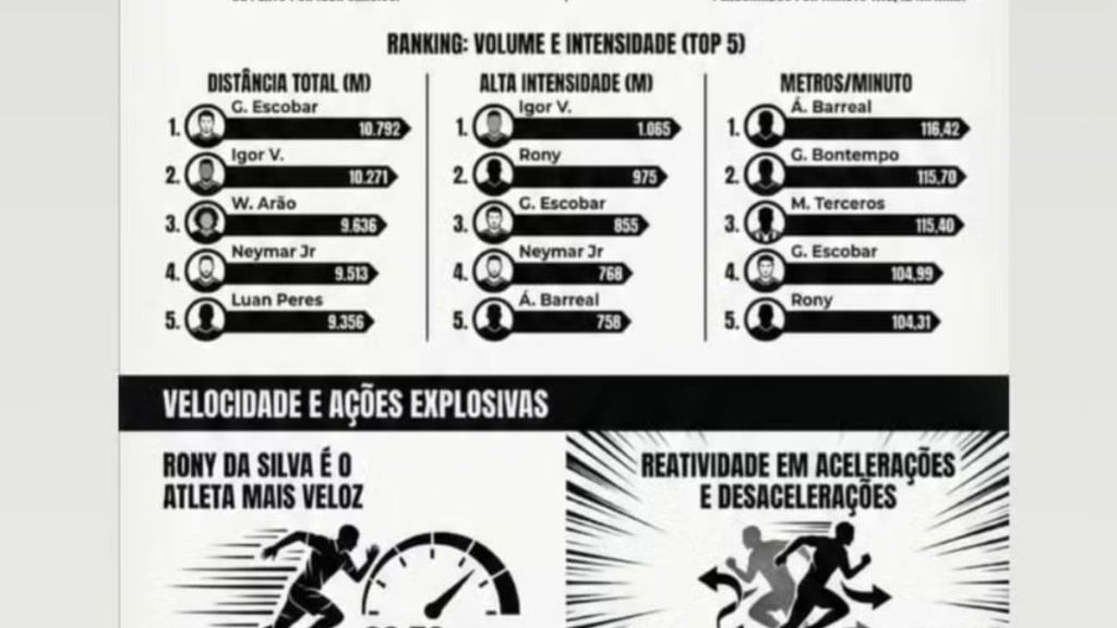 De acordo com o relatório divulgado, Neymar figura entre os principais atletas do elenco em indicadores físicos, como velocidade máxima e número de sprints. Nos dois quesitos, o craque aparece atrás apenas de Rony, reforço contratado recentemente pelo Santos.