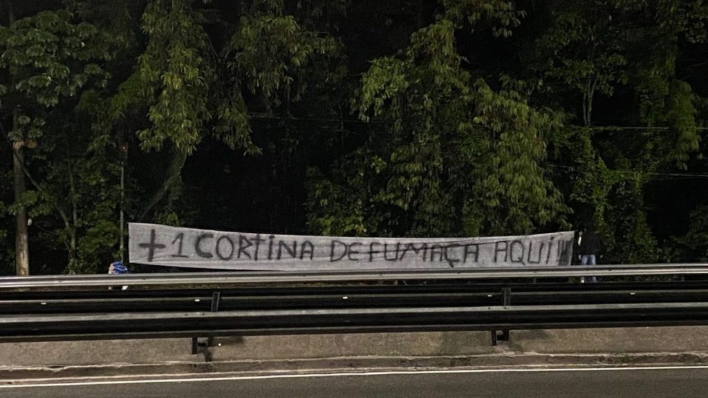 Ao lado da faixa principal, uma bandeira menor trazia a frase “Pinóquio Teixeira”, acompanhada de um desenho do personagem de ficção conhecido pelo nariz crescer ao mentir.
