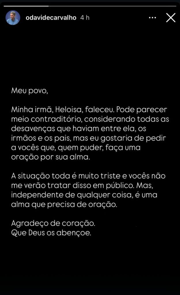 Nas redes sociais, o irmão Davi de Carvalho pediu orações à família e comentou que o momento pede orações pela alma da irmã. “Pode ser meio contraditório, considerando todas as desavenças que havia entre ela, os irmãos e os pais, mas eu gostaria de pedir a vocês que, quem puder, faça uma oração à sua alma”.