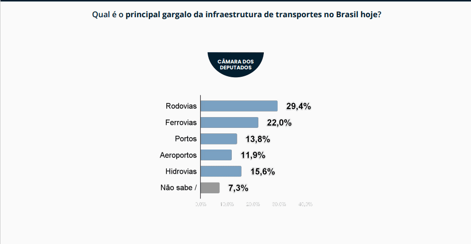 Entre os resultados, a maioria dos parlamentares classificou a infraestrutura de transportes como ruim ou muito ruim. Ao serem questionados sobre gargalos do setor, os deputados apontaram entraves estruturais e burocráticos como fatores que impactam diretamente a competitividade do país.