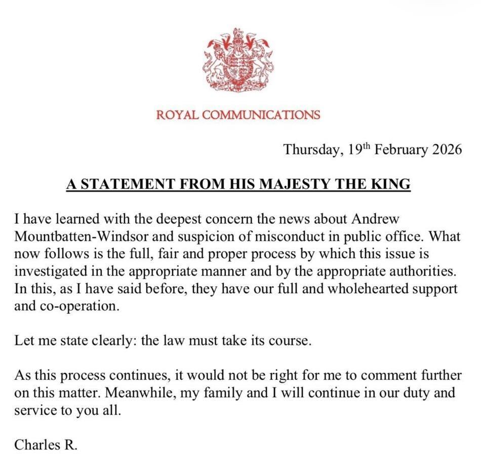“Recebi com profunda preocupação as notícias sobre Andrew Mountbatten-Windsor e a suspeita de má conduta em cargo público. O que se segue agora é o devido processo legal, justo e adequado, pelo qual esta questão será investigada de forma apropriada e pelas autoridades competentes. Neste sentido, como já afirmei, contam com o nosso total e irrestrito apoio e cooperação. Deixem-me ser claro: a lei deve seguir o seu curso. À medida que este processo avança, não seria correto da minha parte comentar mais sobre o assunto. Entretanto, a minha família e eu continuaremos a cumprir o nosso dever e a servir a todos vocês.”