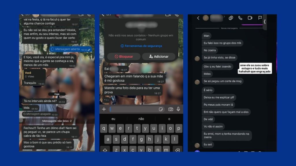 As mensagens foram enviadas na última quinta-feira (27), em um grupo com outros oito estudantes. Prints obtidos pela reportagem mostram ameaças de puxar o cabelo da jovem “até arrancar os fios”, chutá-la em uma festa universitária e deixá-la cega. Depois da repercussão, ele afirmou que tudo não passava de “zoação”.
