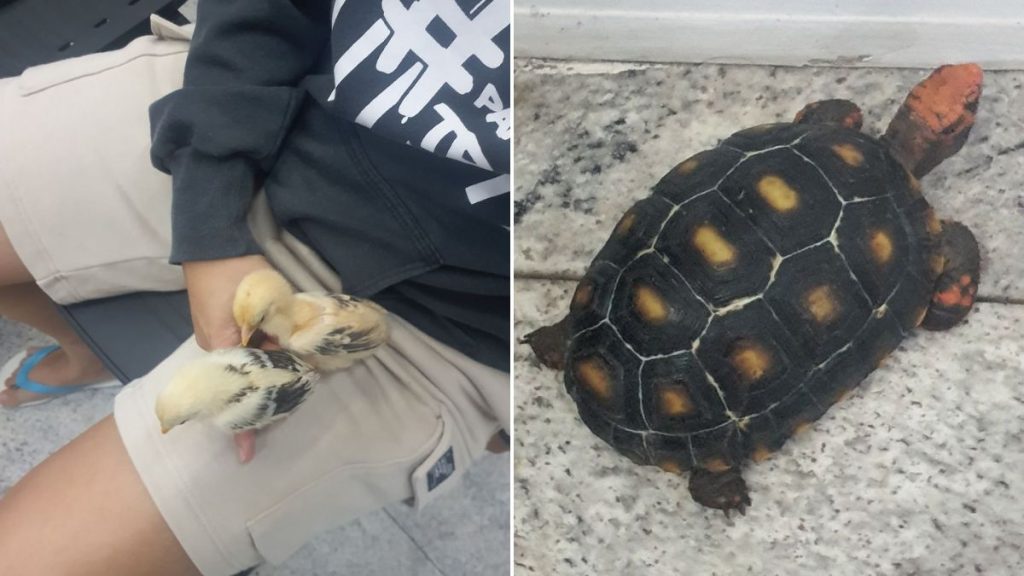 Ainda segundo a parlamentar, o jabuti e os pintinhos ficaram expostos à chuva e às condições do tempo, e “isso poderia colocar a saúde deles em risco e caracterizar maus-tratos”, afirmou. Diante da situação, Roberta Lima utilizou uma rede do tipo passaguá para recolher os animais e os levou para seu próprio apartamento.