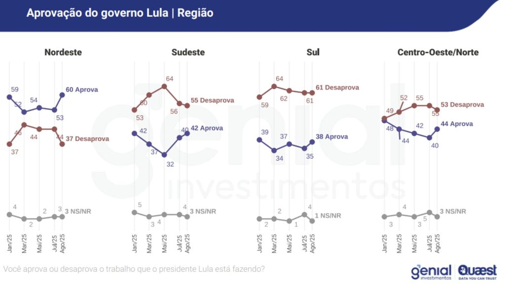 No Nordeste, o índice de aprovação subiu sete pontos percentuais, alcançando 60%, maior valor do ano. A desaprovação caiu na mesma proporção e chegou a 37%, consolidando a região como a única onde o presidente é mais aprovado do que reprovado. Na rodada de julho, a taxa de aprovação era de 53%.