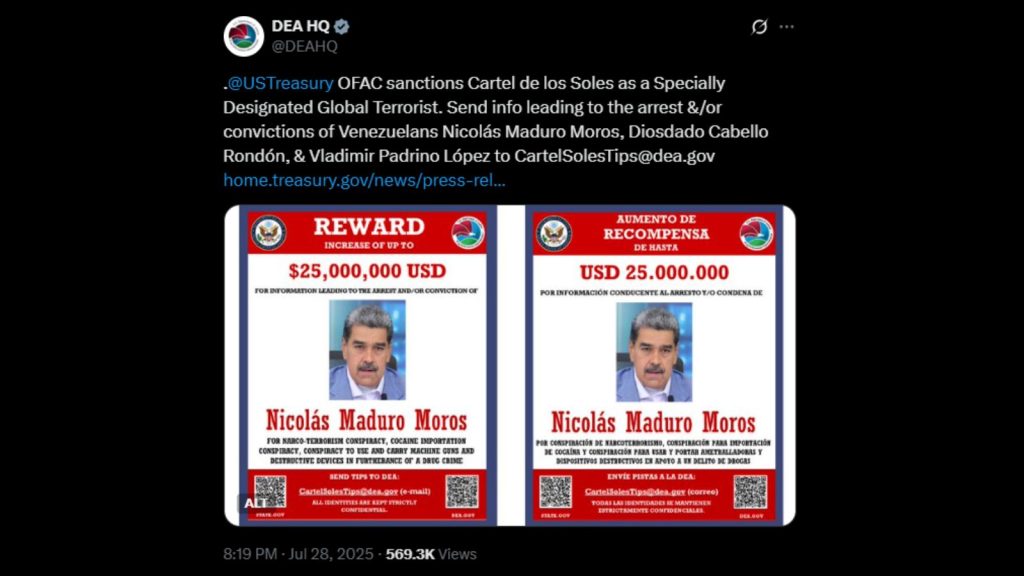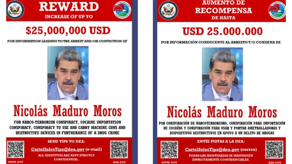 O governo dos Estados Unidos anunciou uma recompensa de US$ 25 milhões — cerca de R$ 140 milhões — por informações que resultem na prisão e/ou condenação do presidente da Venezuela, Nicolás Maduro. O valor foi divulgado nesta segunda-feira (28) pelo Departamento de Justiça, por meio de um cartaz oficial publicado nas redes da Administração de Repressão às Drogas (DEA), agência vinculada ao órgão.