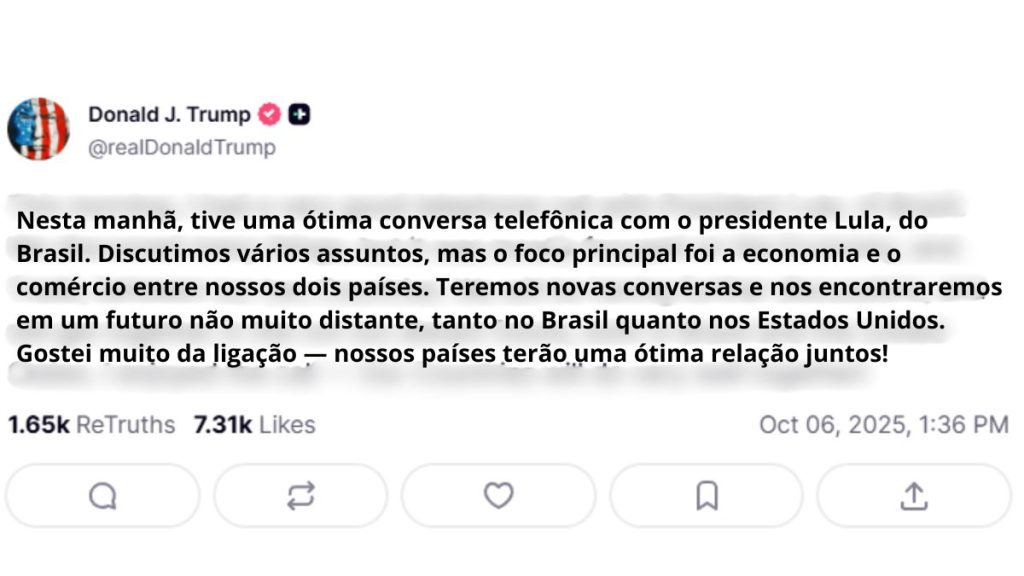 O presidente dos Estados Unidos, Donald Trump, afirmou nesta manhã que teve um “bom telefonema” com o presidente Luiz Inácio Lula da Silva. A conversa, que ocorreu por chamada tradicional e durou cerca de 30 minutos, foi confirmada por ambos os governos e girou em torno de temas econômicos e comerciais. Questões políticas e decisões recentes do Supremo Tribunal Federal (STF), como sanções e restrições a autoridades brasileiras, ficaram de fora da ligação.