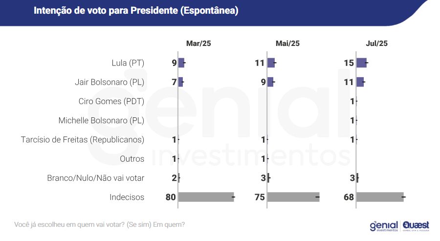 A pesquisa Genial/Quaest ouviu 2.004 pessoas entre os dias 10 e 14 de julho, em todas as regiões do país. A margem de erro é de dois pontos percentuais, para mais ou para menos, e o nível de confiança é de 95%.