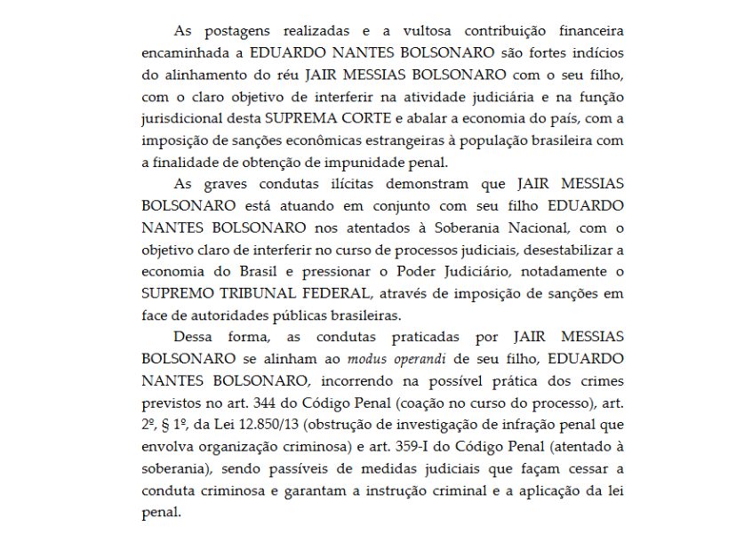 “As ações de JAIR MESSIAS BOLSONARO demonstram que o réu está atuando dolosa e conscientemente de forma ilícita, conjuntamente com o seu filho, EDUARDO NANTES BOLSONARO, com a finalidade de tentar submeter o funcionamento do Supremo Tribunal Federal ao crivo de outro Estado estrangeiro”, escreveu o ministro.