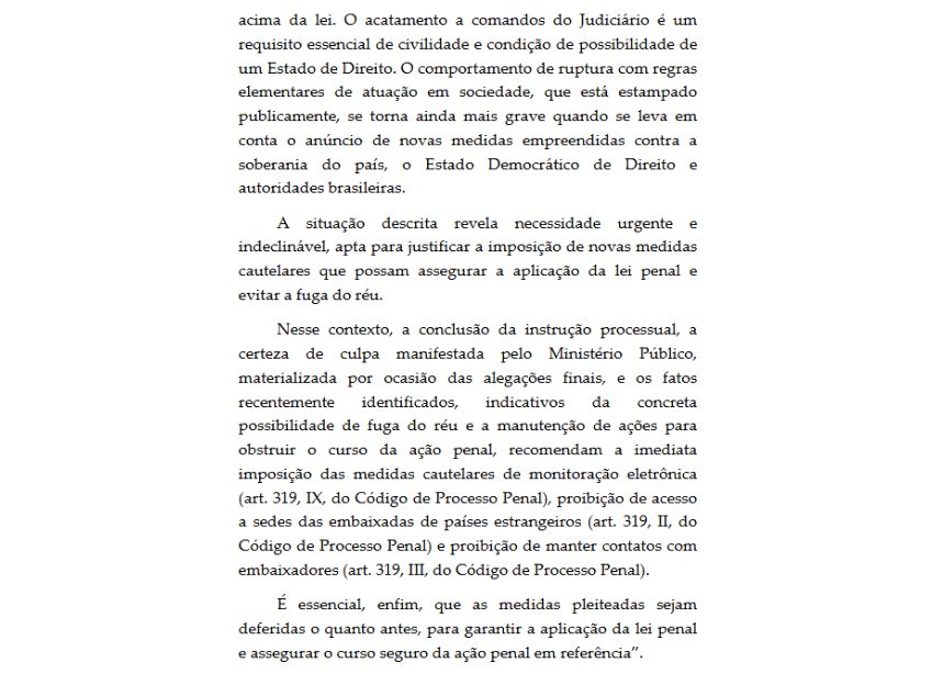Na decisão, Moraes afirma que não há dúvidas quanto à autoria e materialidade dos delitos. “[Bolsonaro] pretende, tanto por declarações e publicações, quanto por meio de induzimento, instigação e auxílio — inclusive financeiro — a EDUARDO NANTES BOLSONARO, o espúrio término da análise de sua responsabilidade penal”, registrou o magistrado.