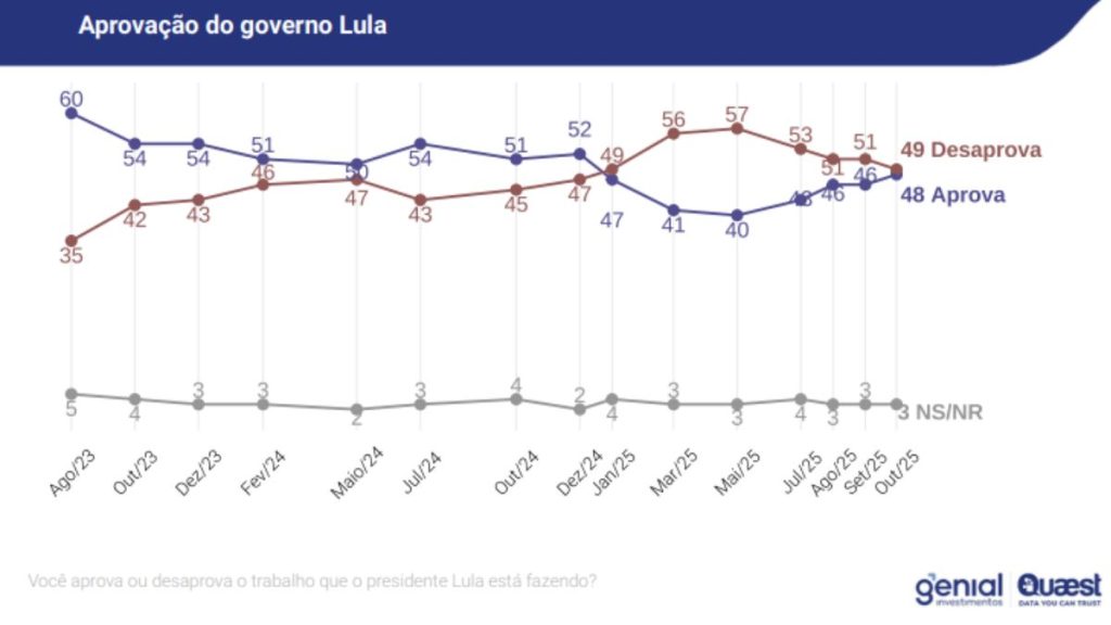 A nova pesquisa Genial/Quaest, divulgada nesta quarta-feira (8), indica empate técnico na percepção popular sobre o governo Luiz Inácio Lula da Silva (PT): 49% dos brasileiros desaprovam a atual gestão, enquanto 48% aprovam. Outros 3% não souberam responder. A margem de erro é de dois pontos percentuais.