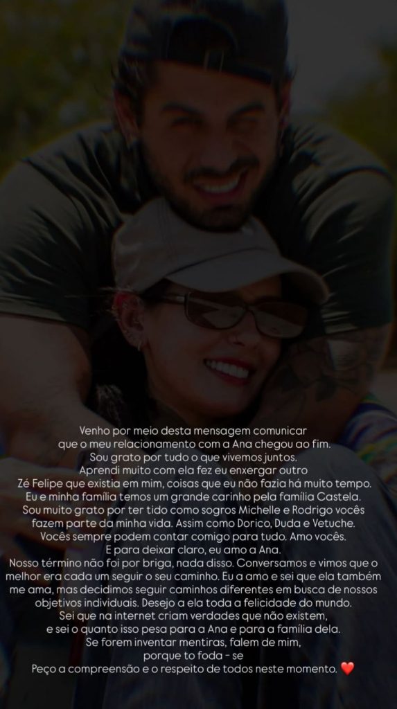 “Eu a amo e sei que ela também me ama, mas decidimos seguir em caminhos diferentes”, disse Zé em um story