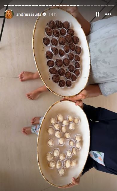 Andressa Suíta compartilhou em suas redes sociais, um momento especial e divertido ao lado de Gusttavo Lima e os filhos Gabriel e Samuel. Todos os preparativos foram feitos em casa, e os filhos ajudaram até a enrolar os docinhos.