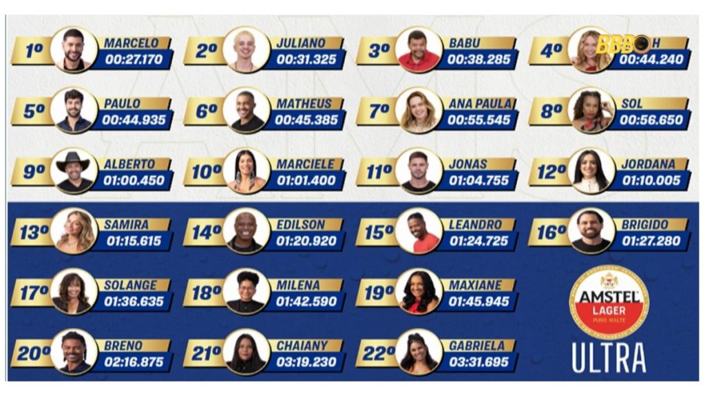 O participante do grupo Pipoca fez o melhor tempo entre todos os jogadores, finalizando a prova em apenas 27.170 segundos, seguido por Juliano Floss, com 37.325. Na sequência, veio Babu, com 38.285, e Sarah Andrade, com 44.240.
