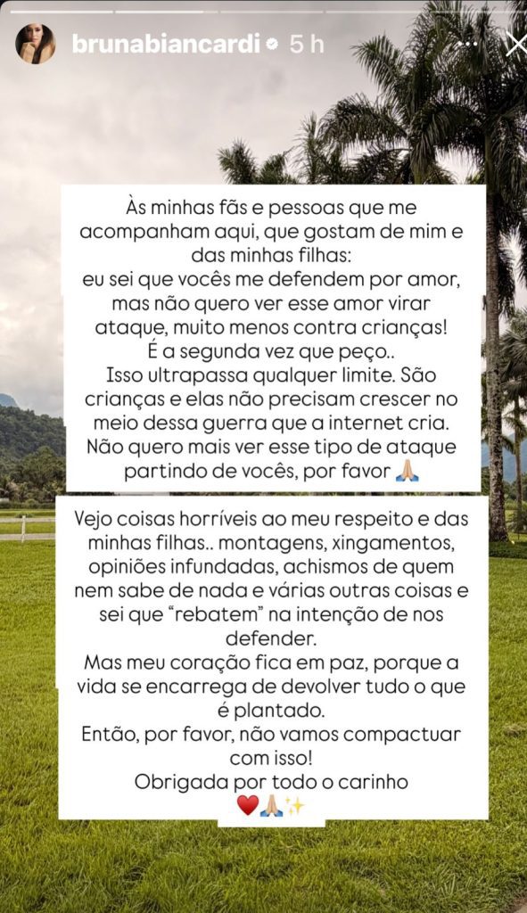 “Às minhas fãs e pessoas que me acompanham aqui, que gostam de mim e das minhas filhas: eu sei que vocês me defendem por amor, mas não quero ver esse amor virar ataque, muito menos contra crianças! É a segunda vez que peço. Isso ultrapassa qualquer limite. São crianças e elas não precisam crescer no meio dessa guerra que a internet cria. Não quero mais ver esse tipo de ataque partindo de vocês, por favor.