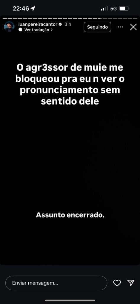 O cantor postou em seus stories uma mensagem dizendo que “o agressor de muié me bloqueou pra eu n ver o pronunciamento sem sentido dele, assunto encerado”. Após a agressão fãs de Luan saem em defesa do cantor e chamam Dado Dolabella para briga. Outro que se manifestou também foi Zé Felipe que disse o seguinte, ” Vocês viram o cara batendo no Luan Pereira? A sorte é que o moleque é bom, muito abençoado. Se tivesse acontecido em Goiás ou aqui no Mato Grosso, ele levaria muita bala [tiro]”, disparou o filho de Leonardo, arrancando gritos da plateia.