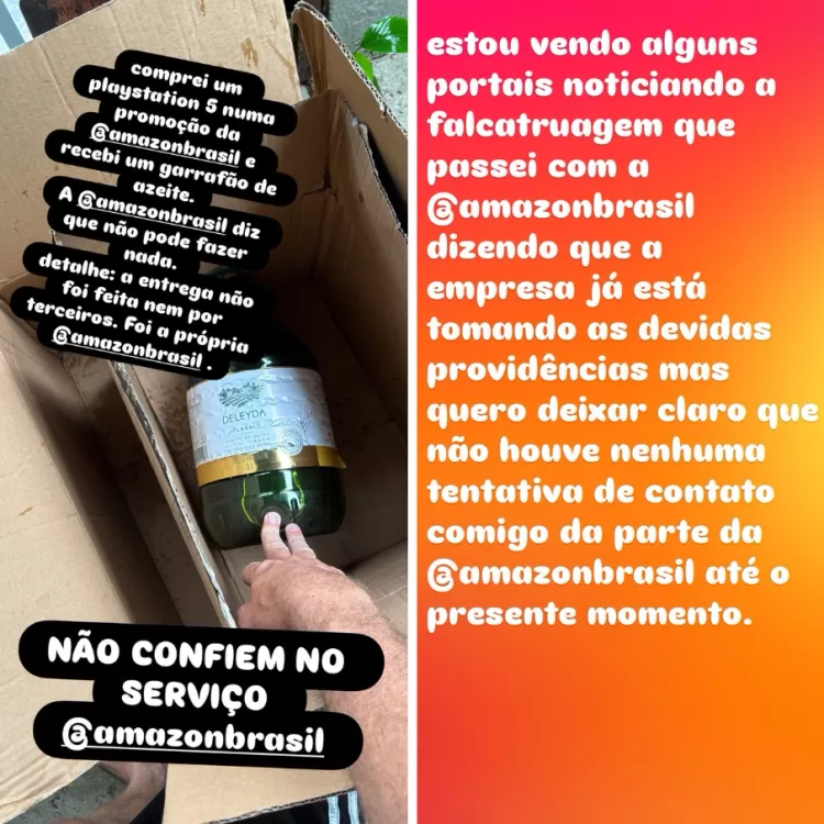 O episódio foi compartilhado pelo próprio ator nos stories do Instagram. “Comprei um PlayStation 5 numa promoção da Amazon e recebi um galão de azeite. A Amazon diz que não pode fazer nada. E o pior: a entrega foi feita pela própria Amazon, sem intermediários”, escreveu, marcando o perfil da empresa e mostrando uma foto do galão de cinco litros.