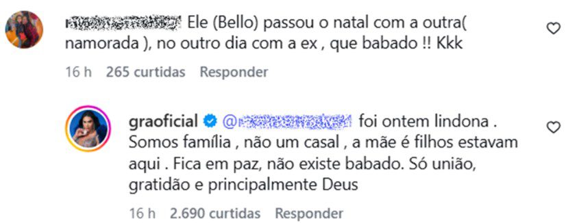 Gracyanne Barbosa foi super criticada nas redes sociais após postar fotos ao lado do cantor Belo, um dia depois do Natal. Belo passou o dia 24 com a atual namorada Rayane Figliuzzi, porém no dia seguinte foi passar ao lado da sua ex Gracyanne Barbosa, da mãe e de outros familiares.