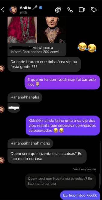 Na conversa pelo whatsapp, Anitta escreve: “De onde tiraram que tinha área vip, na festa gente?, e Mc Daniel responde:”é que eu fui com vc, mas fui barrado”.