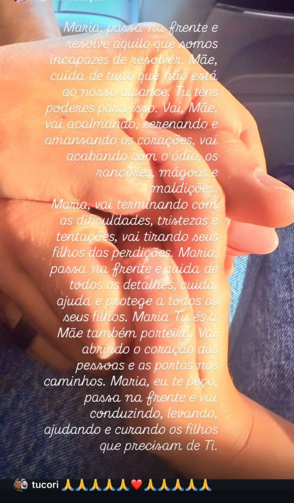 “Meu pai está passando por uma grande cirurgia nesse momento. Tudo aconteceu tão de repente, mas o tempo todo ele tem mostrado a coragem de um verdadeiro guerreiro, pronto para travar a maior luta da sua vida. Eu tenho fé, muita fé, de que venceremos essa batalha que agora se inicia. Hoje sinto ainda mais forte a união dos meus irmãos, que estão se revezando, passando noites em claro no hospital e tendo todo o cuidado sem nem reclamar de cansaço, sinto a força da família e a certeza de que não estamos sozinhos. Porque sozinha, eu sei, eu não teria conseguido enfrentar esse momento.