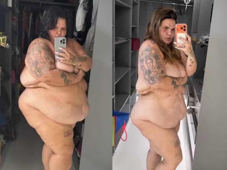 No início do mês, Thais compartilhou a foto acima de um antes e depois nua para mostrar a transformação do próprio corpo. Atualmente, ela pesa 115 kg e segue focada nos treinos e dieta.
