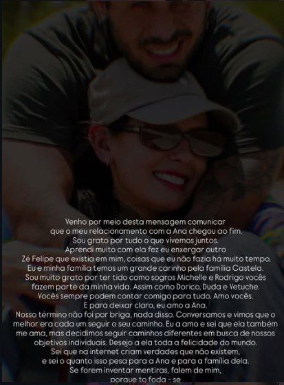 O ex-casal anunciou o fim do namoro na última segunda-feira, 29, por meio das redes sociais. Zé Felipe e Ana Castela surpreenderam o público após anunciar o término de seu relacionamento. EM suas redes sociais eles postaram a seguinte postagem.