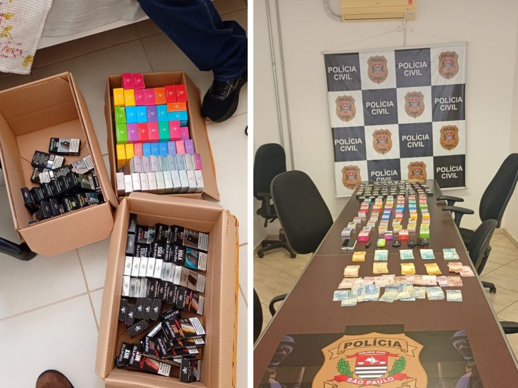 Em um dos quartos, os policiais localizaram R$ 5.168 em dinheiro, uma máquina de cartão, embalagens utilizadas para guardar os produtos, além de unidades já abertas de cigarros eletrônicos.